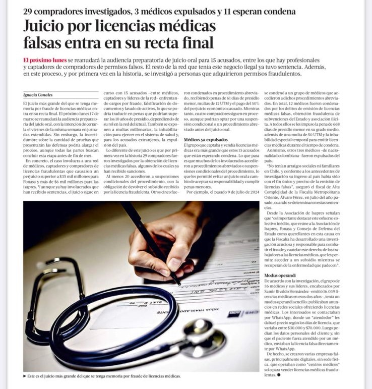 Se trata de un juicio por fraude de licencias médicas falsas en Chile. Se investiga a una red de médicos, captadores y compradores que emitieron y adquirieron permisos fraudulentos, causando un perjuicio económico de más de $41 mil millones para el sistema de salud. Este caso destaca porque, por primera vez, se está procesando no solo a quienes emitieron las licencias falsas, sino también a los compradores